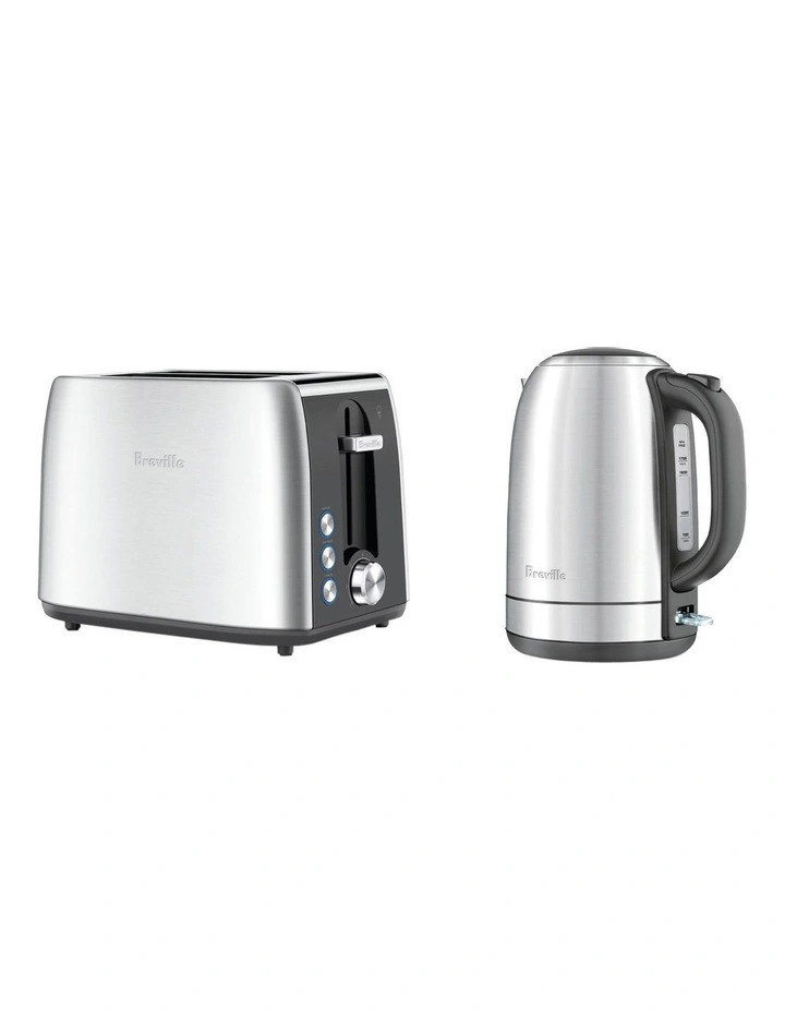 The breakfast pack includes a 1.7L cordless kettle with lid release button and 2 slice toaster with extra wide and deep toasting slots – both in brushed stainless steel.