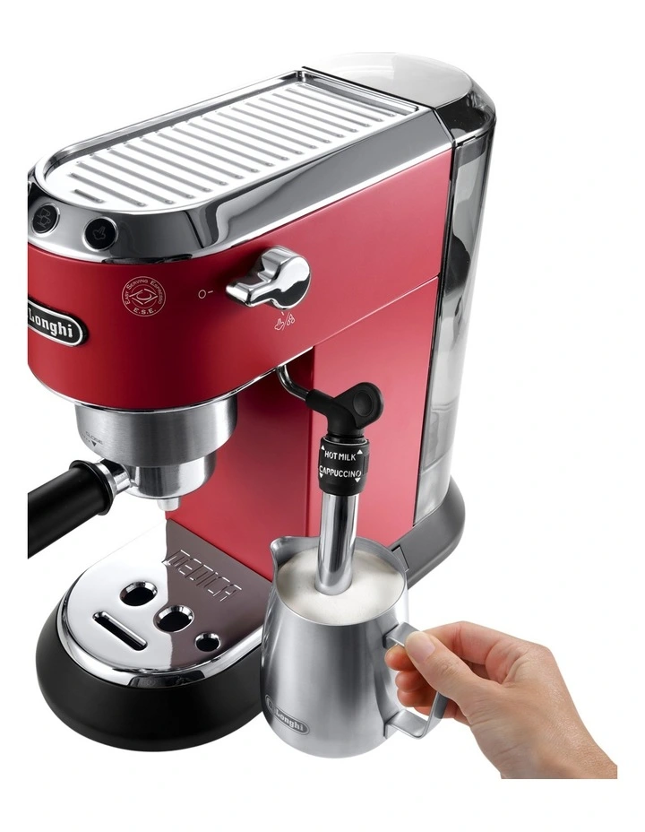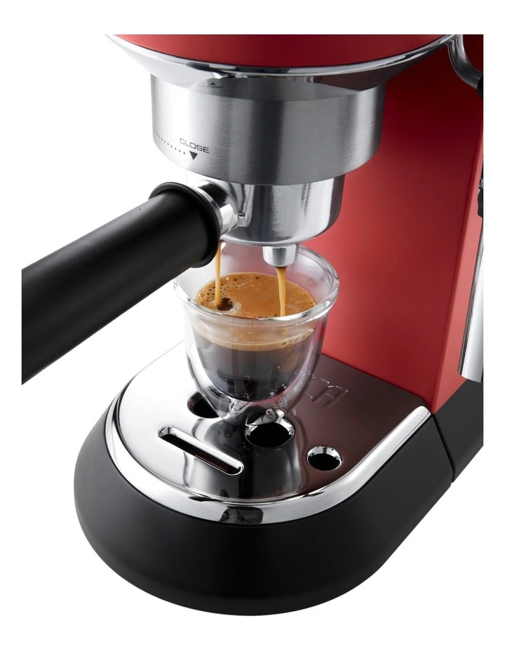 The DeLonghi Dedica manual coffee machine connects two essential elements of design: form and function. The slimline design is simple and elegant, whilst product innovation delivers a professional caf style coffee. It features a simple and intuitive control panel with backlit buttons, thermoblock heating system, self-priming system, and the new adjustable steam wand to produce the ideal level of froth. The professional filter basket is equipped to accommodate both freshly ground beans or Delonghis E.S.E. Pods, the machine is easy to use and provides the user with a full barista experience. Thermoblock heating system: always the perfect temperature Fast heating time: 40 seconds Self-priming system means the machine is always ready for use Flow stop function to personalize your coffee length 15-bar professional pump Professional filter holder for ground coffee (1 or 2 cups) and E.S.E. Pod Adjustable Cappuccino System: perfect to prepare hot milk, milk froth for Cappuccinos and hot water for teas and infusions Double Drip Tray: two-level cup holder to house glasses and tall cups of up to13cm for long coffee and milk drinks Slim dimensions: only 15 cm width Full metal body Cup warmer on top Easy-to-use control panel with 3 illuminated buttons On/Off button with automatic stand-by to save energy consumption after a period of non-use Descaling alarm Removable water tank Removable drip tray with water level indicator Anti-Drip system 1350W Power Dimensions: 149mm (W) x 330mm (D) x 305 (H) 4.0 kg