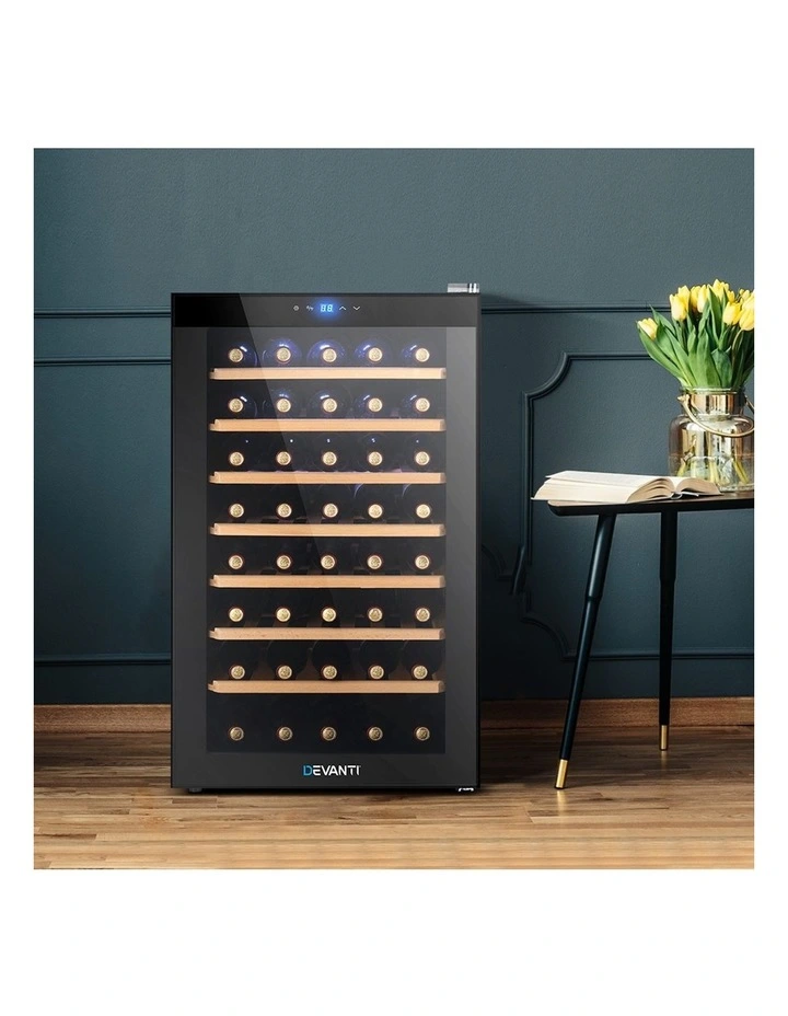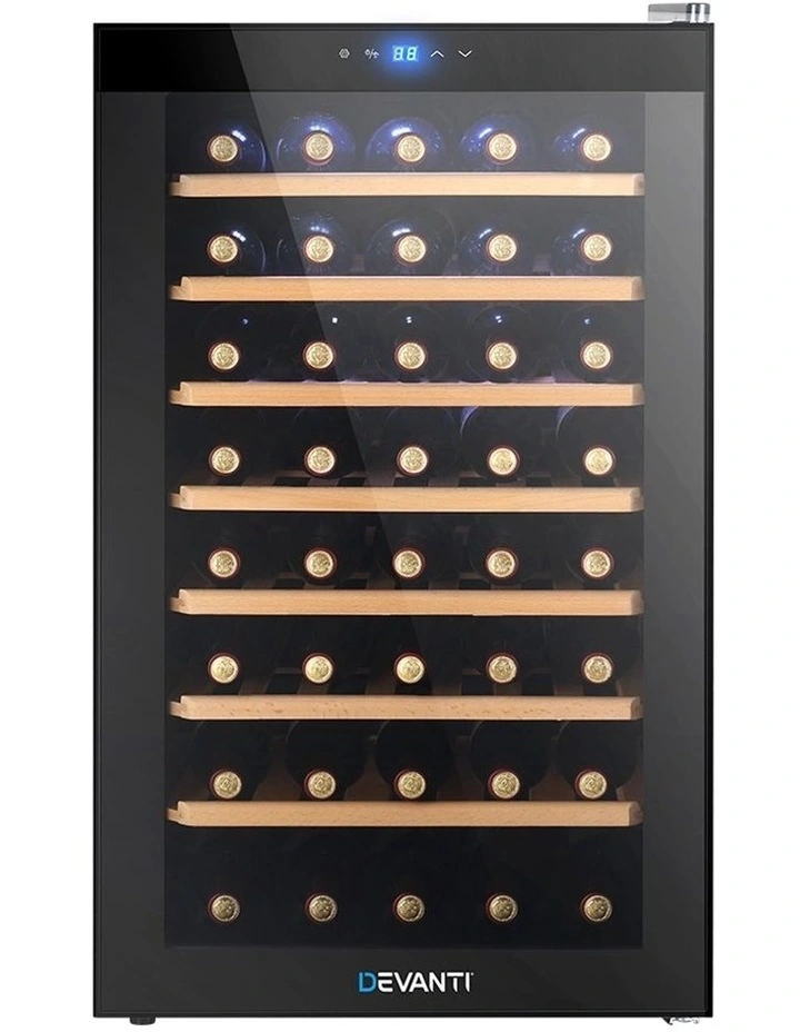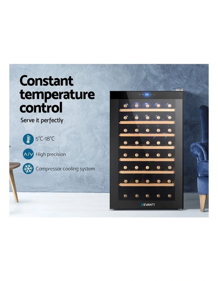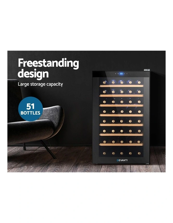 Need a good and reliable wine cooler? Look no further than our Devanti Wine Cooler. Utilising the latest high precision compression cooling technology, our wine cooler ensures your favourite vintages are well kept at their prescribed temperatures with its 360 degree circulated cool air. The touch control panel makes for easy adjustments with temperature control and the built-in interior LED light helps you to see your wines in the best light. The stylish and compact design stores up to 51 bottles of wine in a neat and tidy shelving system. The shelves are removable to allow for changing the layout according to the contents and for easy cleaning as well. Better still, the double-glazed glass door is UV-resistant and provides excellent insulation. The wine cooler works quietly and efficiently and has a handy child-lock on its control panel for total peace of mind use.