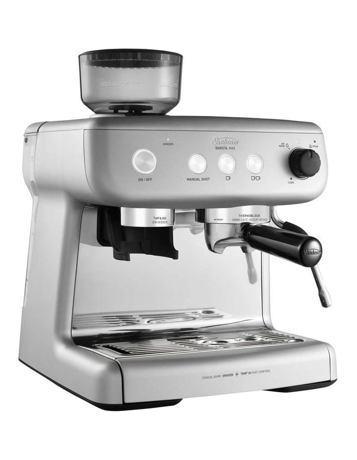 Indulge your love for fresh coffee beans with the Sunbeam Barista Max coffee machine.The built-in conical burr grinder delivers fresh tasting coffee with every pour. The 58mm commercial-sized group head and PID controller, provide the perfect dimensions and temperature control for extracting coffee and creating a rich, balanced flavour. Bring out your inner-barista with the powerful steam wand that creates velvety smooth milk.